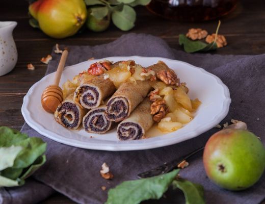 Борошно пшеничне, молоко, яйця, цукор, сіль, вершкове масло або олія, мак відварений, цукор, ванільний цукор (або мед).